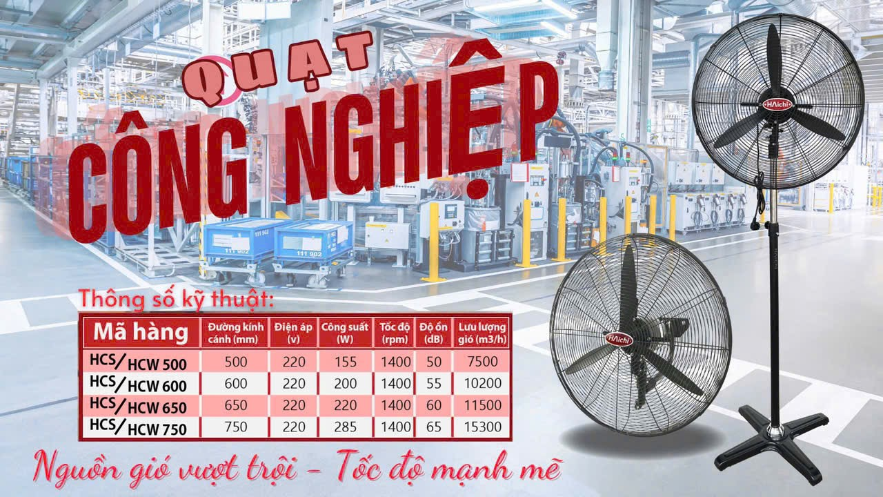 - Quạt đứng công nghiệp Haichi HCS-500: Công suất 155W, Lưu lượng gió 7.500 m3/h, Tốc độ quay 1.400 vòng/phút, độ ồn 50 dB.